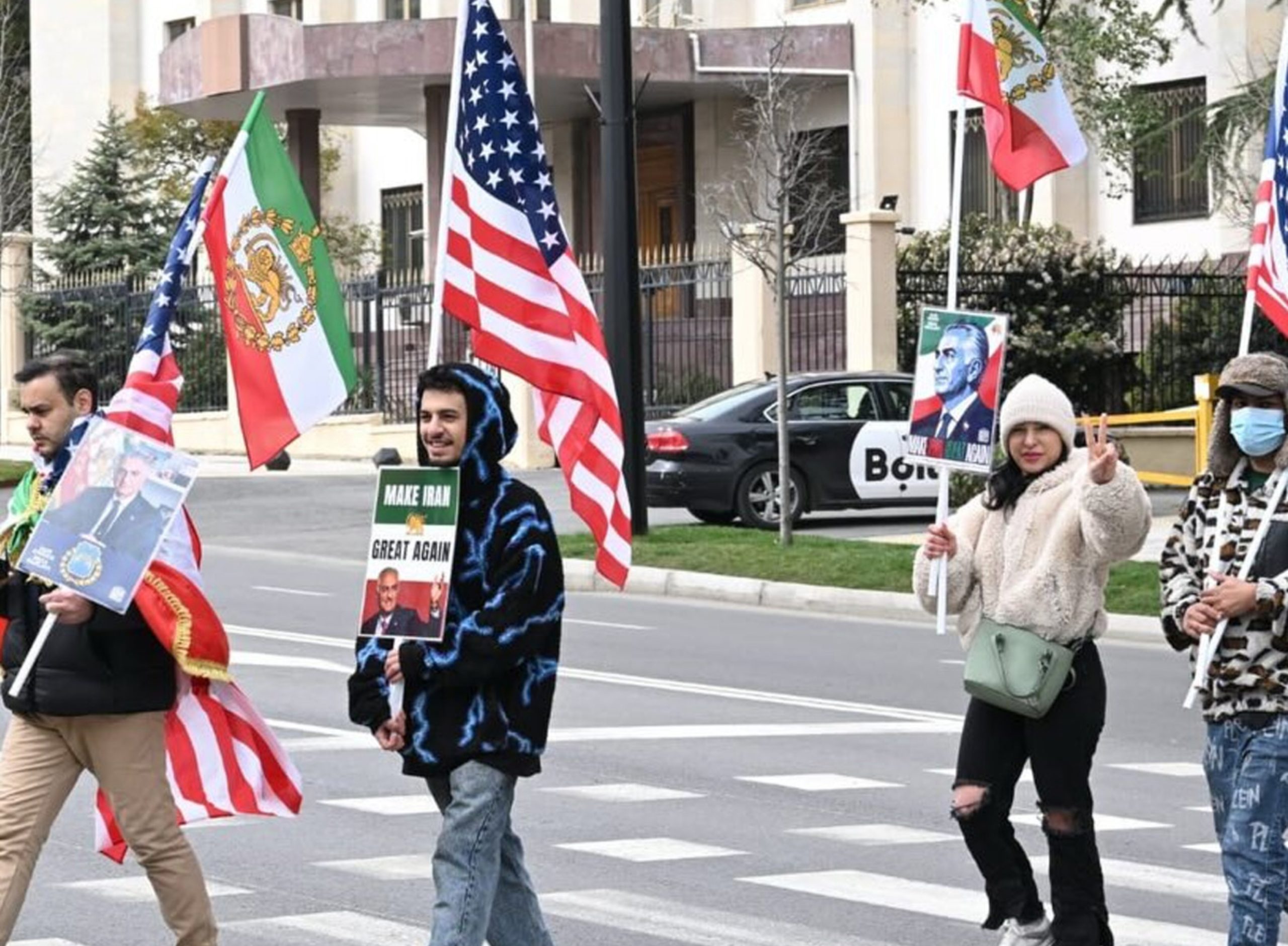 საქართველოში მცხოვრები ირანელები ამერიკისა და ირანი დროშებით ირანის საელჩოსთან შეიკრიბნენ.