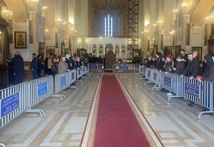 ტაძარში დაფინეს წითელი ხალიჩა, ასევე აღმართეს ე.წ. რკინის ბარიკადები, რომლის მიღმაც მრევლია შეკრებილი.