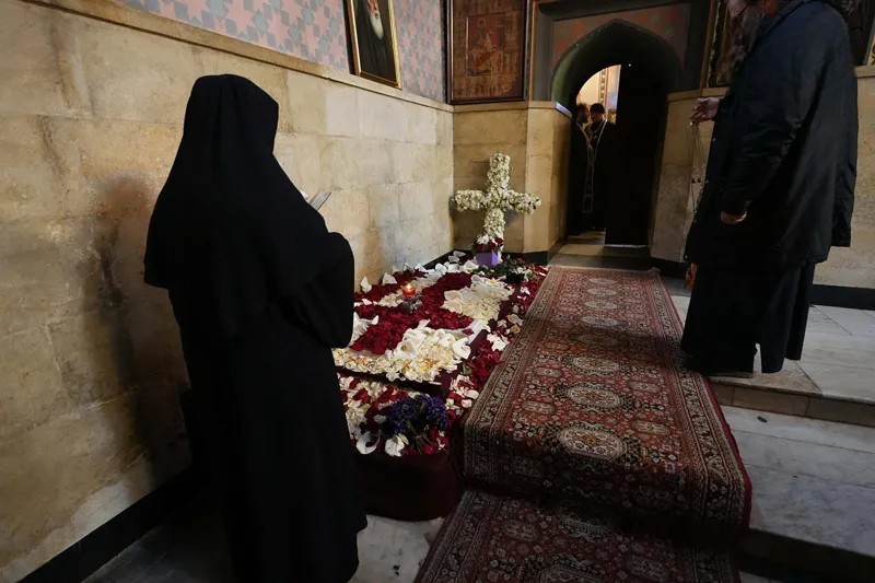 სიონის საპატრიარქო ტაძარში, ილია მეორის საფლავზე, მრევლი პატივის მისაგებად დილიდან მიდის.