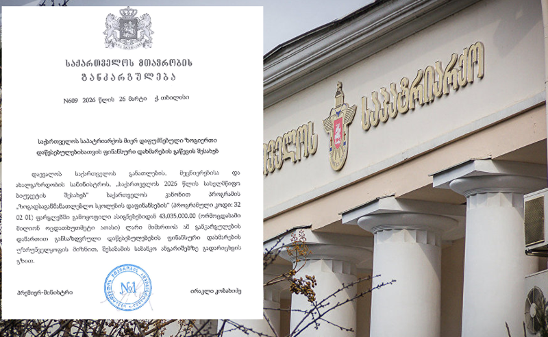 “დაევალოს საქართველოს განათლების, მეცნიერებისა და ახალგაზრდობის სამინისტროს, „საქართველოს 2026 წლის სახელმწიფო პროგრამის ბიუჯეტის შესახებ” საქართველოს კანონით „ზოგადსაგანმანათლებლო სკოლების დაფინანსების“ (პროგრამული კოდი: 32 02 01) ფარგლებში გამოყოფილი ასიგნებებიდან 43,035,000.00 (ორმოცდასამი მილიონ ოცდათხუთმეტი ათასი) ლარი მიმართოს ამ განკარგულების დანართით განსაზღვრული დაწესებულებების ფინანსური დახმარების უზრუნველყოფის მიზნით, შესაბამის საბანკო ანგარიშებზე გადარიცხვის გზით”, – წერია განკარგულებაში.