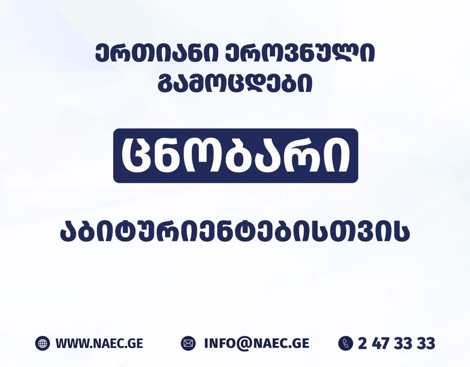 შეფასებისა და გამოცდების ეროვნულმა ცენტრმა 2026 წლის ერთიან ეროვნულ გამოცდებთან დაკავშირებით საინფორმაციო დოკუმენტი – „ცნობარი აბიტურიენტებისათვის“ გამოაქვეყნა.