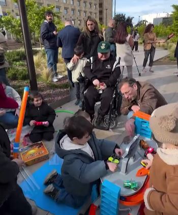 კანცელარიასთან დიუშენის კუნთოვანი დისტროფიის მქონე ბავშვები და მათი მხარდამჭერები არიან შეკრებილები.