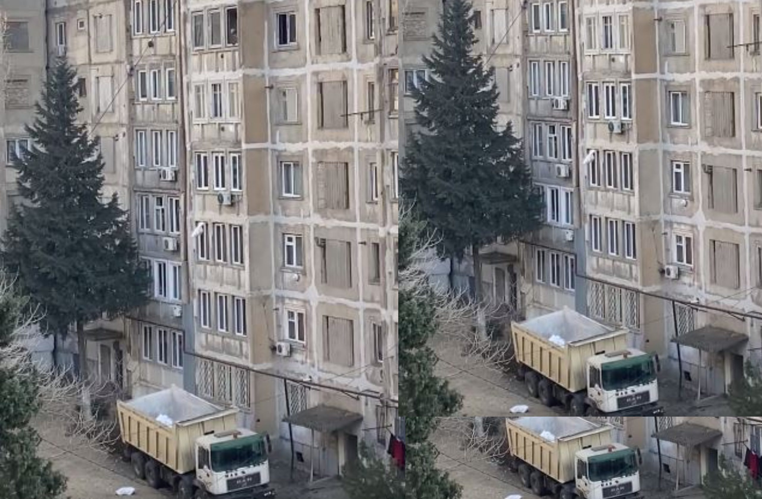ვარკეთილში მე-7 სართულიდან სარემონტო ტომრებს ისვრიან.